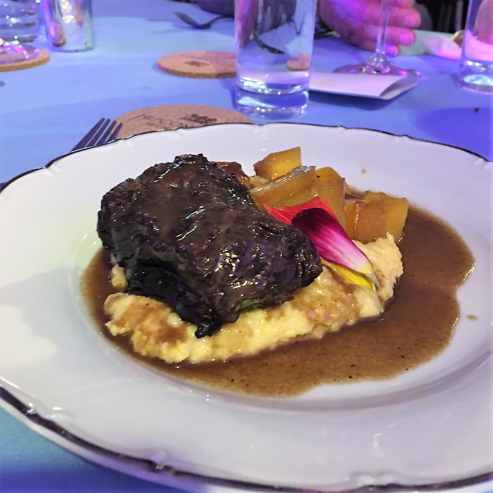 Red wine slow braised beef, soft polenta and maple roasted squash